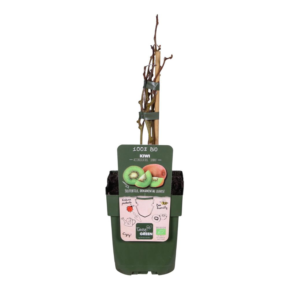 Tasty Green, 100% biologisch gekweekt fruit. Dat wil zeggen dat er tijdens de teelt uitsluitend plantaardige en dierlijke materialen gebruikt zijn. De pot en het etiket zijn gemaakt van gerecycled plastic en daarom een schone oplossing voor het milieu. ‘Actinidia delciosioa Jenny’ is een gemakkelijke en zelfbestuivende kiwi. De kiwi vind zijn oorsprong in China. In het begin van de 20e eeuw werden er zaden naar Nieuw-Zeeland gehaald. Toen de kiwi een belangrijk export product werd is de plant vernoemd naar de bekende loopvogel, de Kiwi. Het is een snel groeiende slingerende klimplant en kan het beste tegen een klimrek, schutting of pergola geplaatst worden. De kiwi bloeit in de maanden mei en juni met wit-roze bloemen. Begin september zullen de eerste rijpe vruchten verschijnen. Houdt er rekening mee dat het enkele jaren kan duren voordat de plant vruchten gaat geven. Over het algemeen duurt dit zo’n drie tot vijf jaar. De vruchten hebben een harige schil, zijn ovaal van vorm en hebben heldergroen vruchtvlees, met een witte kern en een ring van zwarte pitjes rondom deze kern. De kiwi is gezond en bevat veel vitamine C.
