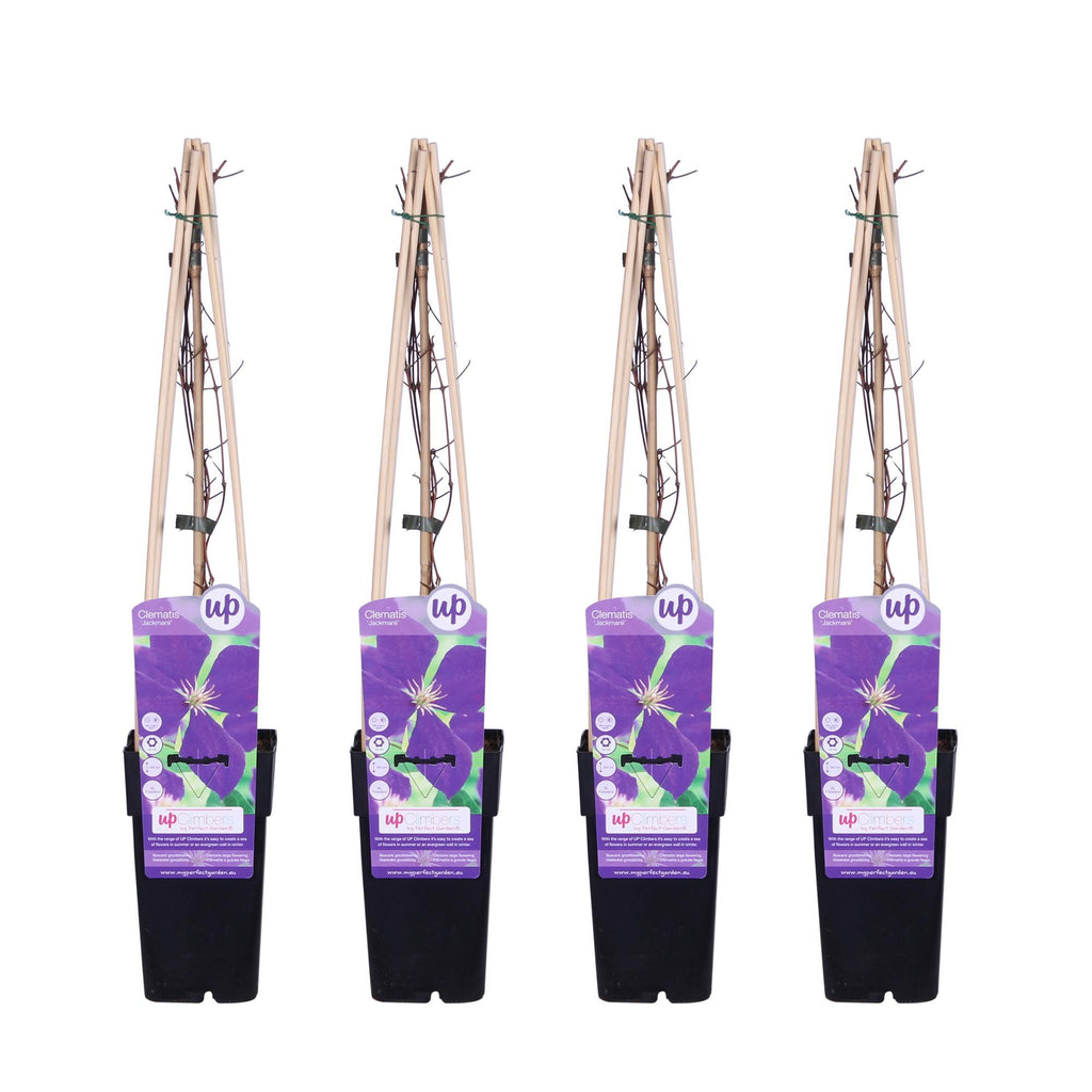 'Clematis Jackmanii' is een clematis met grote, diep paars-blauwe bloemen. Deze verschijnen tijdens de zomermaanden, juli tot september. De clematis is een winterharde plant die de Nederlandse winter uitstekend kan verdragen. Hij heeft een grote sierwaarde vanwege de vorm mooie en bloeiwijze. Snoei de clematis aan het einde van de winter terug tot 30 cm boven de grond, zo krijg je de rijkste bloei en hou je de plant goed in vorm. Wanneer je de clematis langs een rek of schutting wilt laten groeien is het wenselijk dat de plant een beetje helpt. Dit kun je doen door de nieuwe uitlopers netjes langs het rek te maken of door de schutting te leiden.