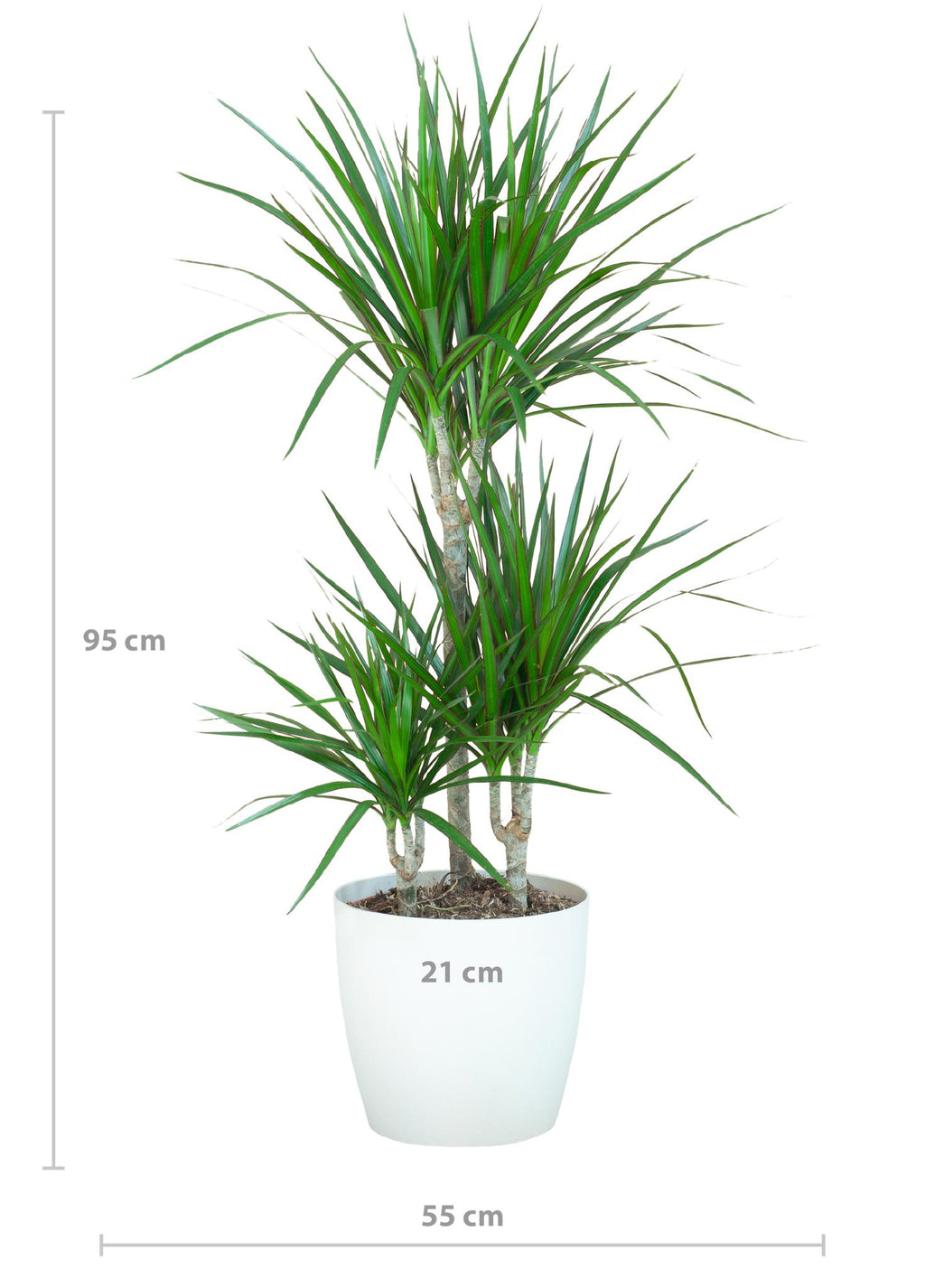 De Dracaena marginata is een groene kamerplant die een praktische tropen naar je huis brengt. Het lijkt op een palmboom, met een stevige stam en lange, slanke bladeren. Het is een ideale keuze voor mensen met minder groene vingers. Oorspronkelijk te vinden in Afrika, verschijnt de Dracaena soms ook in tropische regio's, voornamelijk in hoger gelegen gebieden, waar hij hoogtes tot wel 14 meter kan bereiken! In zijn stam bewaart de Dracaena water en maximale als reserve, voor het geval dat hij ze later nodig heeft. Hierdoor kan de plant ook ruime tijd zonder water!