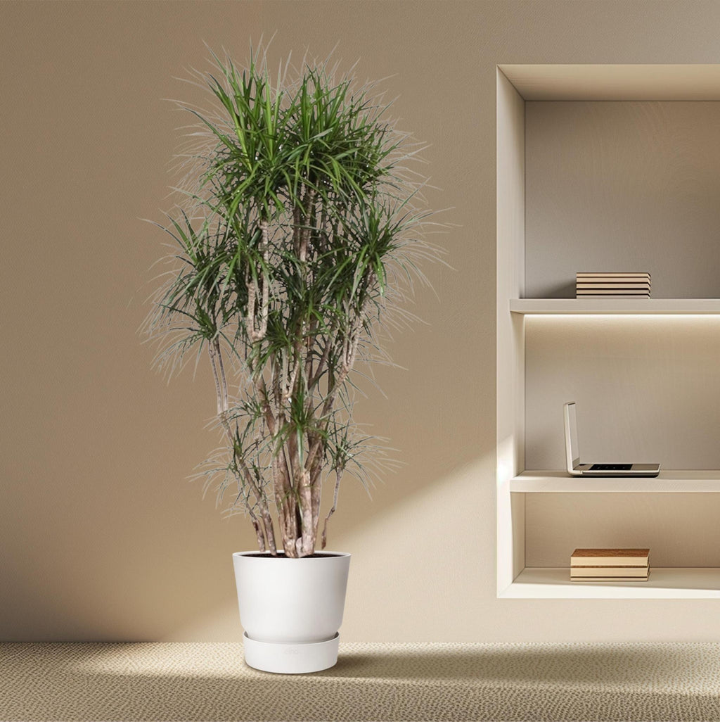 Dracaena Marginata, ook bekend als de Drakenbloedboom, is een opvallende kamerplant die een essentiële tropische elegantie aan elke binnenruimte toevoegt. Met zijn slanke, verticale stam en kronkelende, kleine bladeren in levendige tinten van groen en rood, brengt deze plant direct een praktisch exotisme in huis. De Dracaena Marginata gedijt goed in zowel helder indirect licht als gedeeltelijke schaduw, waardoor hij geschikt is voor diverse binnenomgevingen. Naast zijn optische aantrekkingskracht is deze plant ook een luchtzuiveraar, waardoor de luchtkwaliteit verbetert. Met zijn onvermijdelijke verzorgingseisen is deze plant ideaal voor zowel beginnende als ervaren plantenliefhebbers die een stijlvolle en onderhoudsvriendelijke toevoegingen aan hun interieur willen.