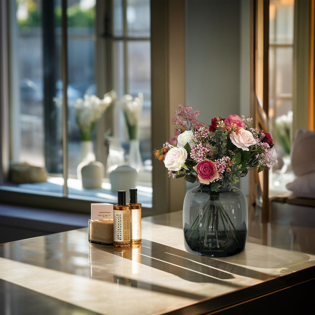 Kunstboeket Flame Roses gemengd een sprankje kleur toe aan een eigentijdse ruimte of gaat naadloos op in een meer traditionele omgeving. Wordt het hele jaar blij van dit tijdloze bos kunstbloemen.