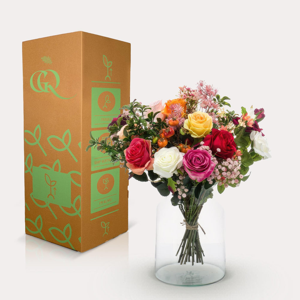 Dit prachtige kunstboeket bestaat uit schitterend gezongen rozen, aangevuld met groen blad en besjes. Boeket Flame Roses is samengesteld door topbloemisten en wordt met de hand gebonden. Op deze manier geniet je het hele jaar door van een uniek en kleurrijke bloemstuk in je interieur.