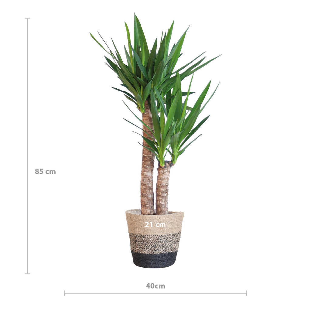 De Yucca, ook bekend als Palmlelie, is een indrukwekkende groene kamerplant met lange, stevige, zwaardvormige bladeren. Deze bladeren geven de plant een stoere en robuuste uitstraling, waardoor hij een echte blikvanger is in elk interieur.