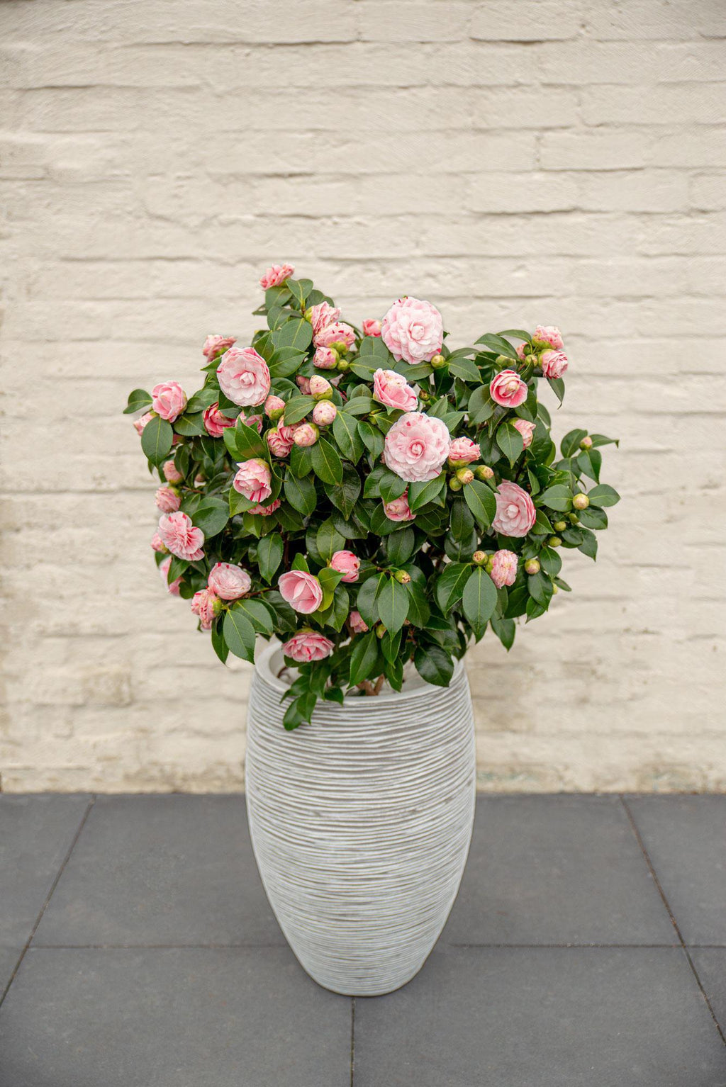 De Camellia is een groenblijvende struik die in de wintermaanden bloeit met gevulde bloemen.