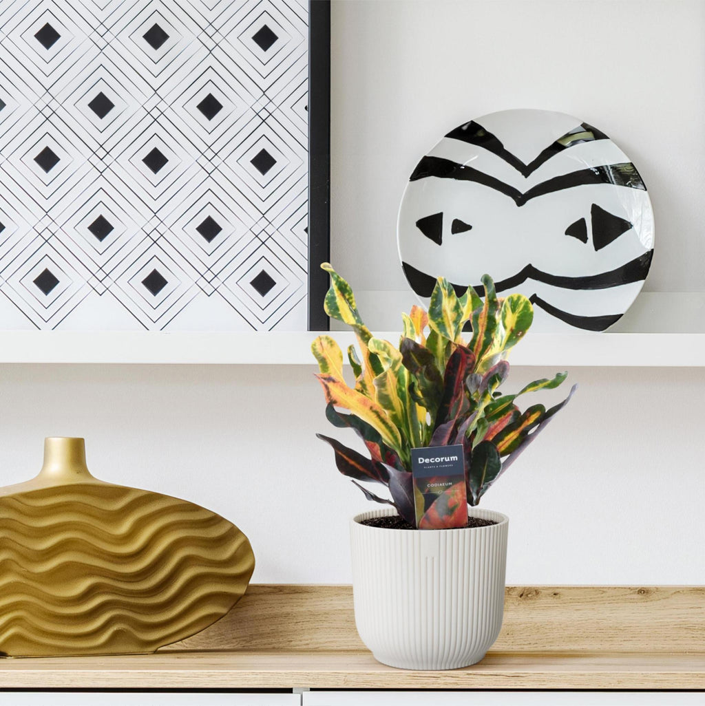 Betreed de wereld van levendige kleuren met de Codiaeum Variegatum 'Mammi'. Deze opvallende kamerplant, ook bekend als de Croton 'Mammi', imponeert met zijn bonte bladeren in warme tinten van rood, oranje en geel. De unieke bladtekeningen voegen een speels karakter toe aan elke ruimte. De Codiaeum Variegatum 'Mammi' gedijt in goed verlichte omgevingen en vraagt weinig onderhoud. Voeg een levendig accent toe aan je interieur en laat deze Croton-variant stralen als een kunstwerk in je groene collectie. Verrijk je leefruimte met de energieke pracht van de Codiaeum Variegatum 'Mammi'.