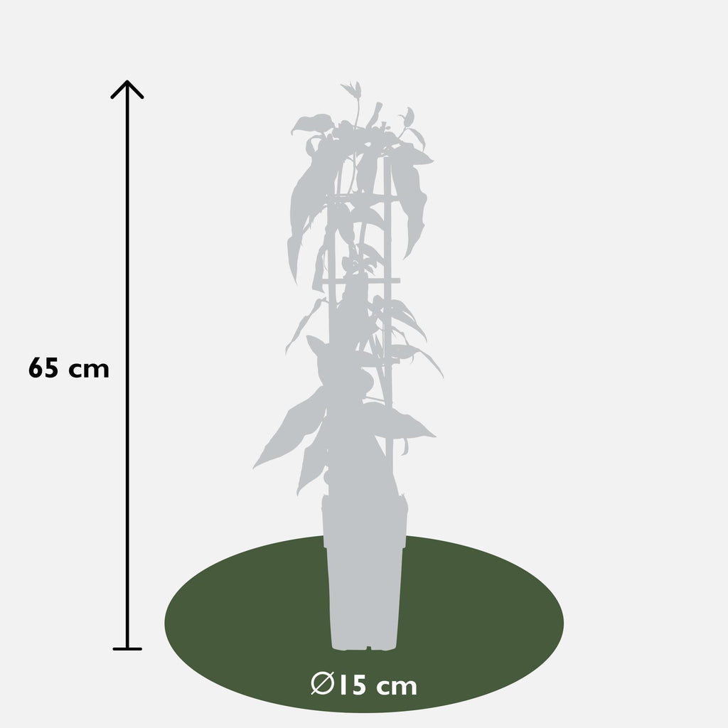 'Lonicera henryi Copper Beauty' is een bladbehoudende, wintergroene kamperfoelie. In tegenstelling tot de meeste andere kamperfoelies blijft de 'Lonicera henryi Copper Beauty' groen in zachte winters. Het is een klimplant met vijftallige, opvallende geelwitte bloemen en grote groene bladeren. Hij staat ook bekend om de zoete geur die de plant verspreidt, vooral in de avonden. Om de plant beter te laten klimmen kun je hem het beste een beetje helpen en langs een rek op laten klimmen. De kamperfoelie is gemakkelijk in onderhoud en kan op alle plaatsen staan. Op een plaats in de schaduw van halfschaduw groeit hij ook goed, maar zorgt wel voor een minder rijke bloei. Zorg ervoor dat je de Lonicera regelmatig snoeit om de plant mooi fris en compact te houden.