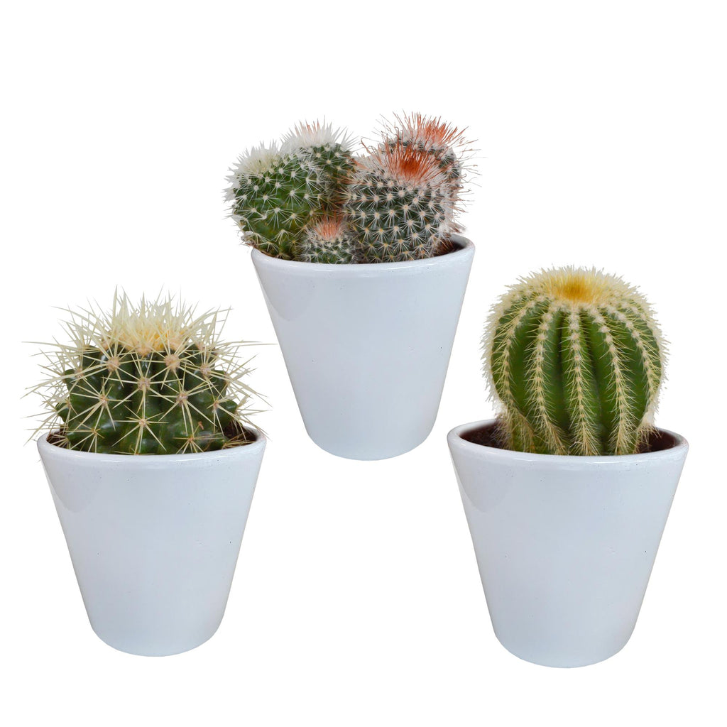 Wat een bolle boel in deze mix! Deze mix bestaat uit 3 bolcactussen die in kleur, hoogte én vorm van elkaar verschillen. De bolcactussen komen rechtstreeks van de kweker en zijn dus van de hoogste kwaliteit. Deze mix van bollen wordt geleverd in een witte pot.