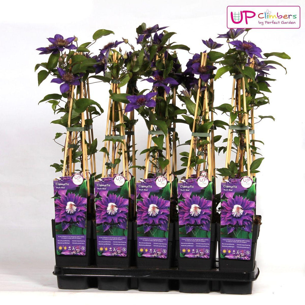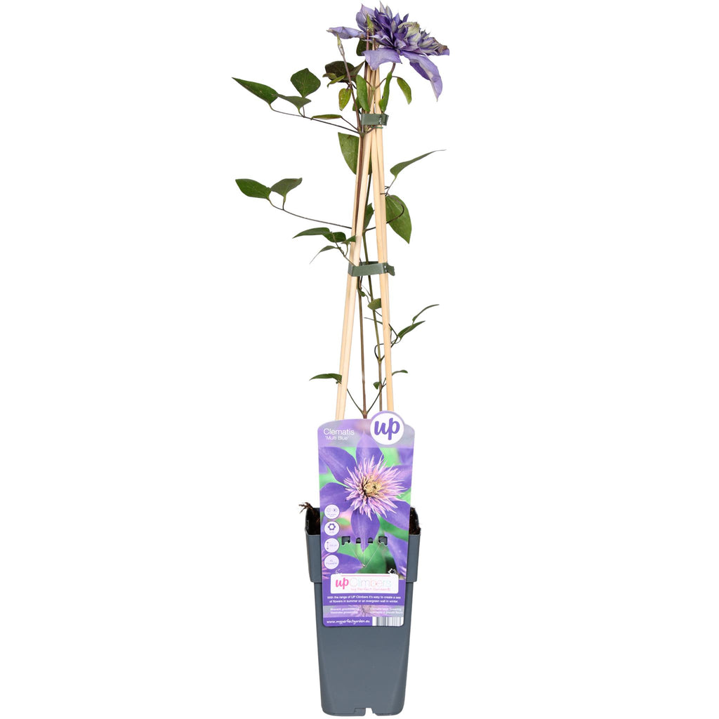 'Clematis Multi Blue' behoort tot de bosrank soorten met de grootste bloemen. Hij bloeit twee keer per jaar, dus een echte blikvanger in de tuin. De eerste bloei is rond mei-juni met violetblauwe bloemen en de tweede bloei is tussen juli en september. Nadat de 'Clematis Multi Blue' voor de eerste keer bloem heeft gegeven kun je deze het beste terug snoeien, zodat hij herhaaldelijk voor de tweede keer gaat bloeien. De clematis heeft een nette en compacte goei en is geschikt voor zowel grote als kleine tuinen.