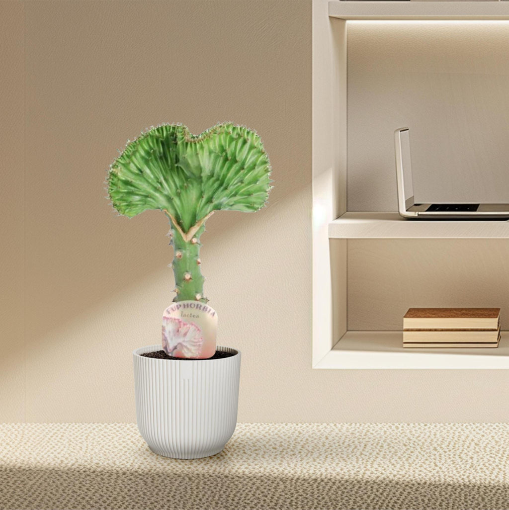 De Euphorbia lactea Cristata, ook bekend als de koraalcactus, is een buitengewone en unieke succulent die de aandacht trekt met zijn fascinerende gekristalliseerde groeiwijze. Deze sierlijke cactus onderscheidt zich door zijn golvende, gecreëerde vorm die doet denken aan koraalriffen. Met zijn groene kleur en opvallende kronkelende vorm besproken de Euphorbia lactea Cristata een praktische exotiek toe aan elke plantencollectie. Gemakkelijk te verzorgen en ideaal voor liefhebbers van aparte planten, zal deze koraalcactus zeker een boeiend element zijn.
