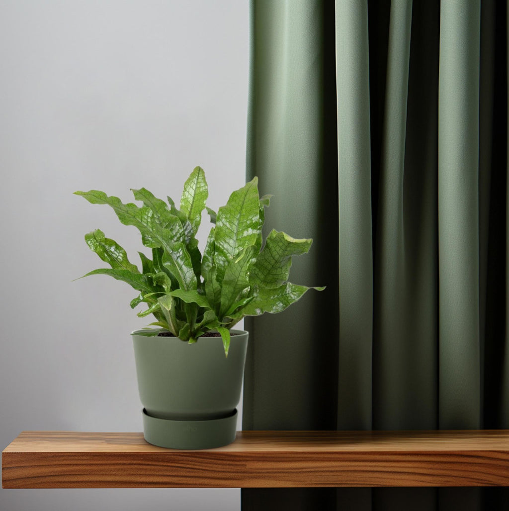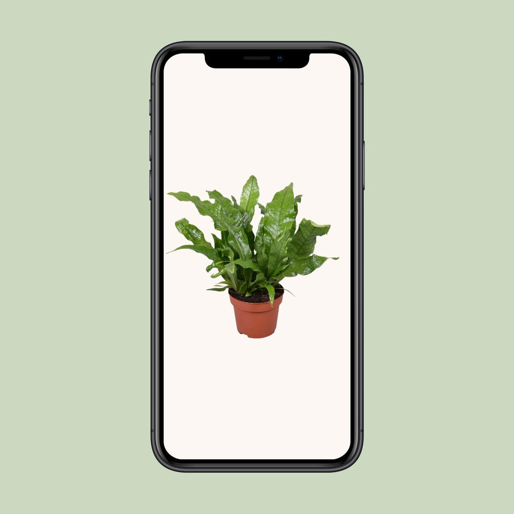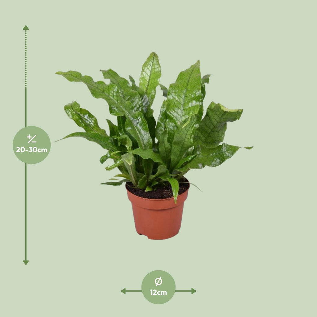 De Klimmende vogelnestvaren wordt geleverd in een maat van 12 cm, perfect voor kleine ruimtes.