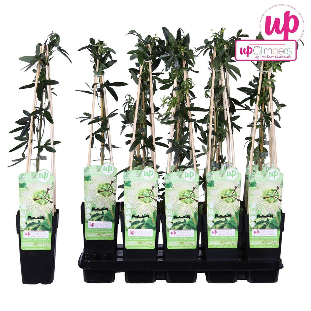 'Passiflora caerulea Constance Elliot' is een klimplant met prachtige ivoorwitte passiebloemen. De plant komt oorspronkelijk uit centraal en west Zuid-Amerika, maar nu kan je ook tropische sferen in eigen tuin creëren. Van juni tot september kun je bloemen in de passiflora verwachten. De Passiebloem is een echte mooi weer bloeier. Op warme dagen met veel licht/zon zullen de knoppen open springen. Op wat koudere en donkere dagen zullen er slechts weinig bloemen open springen. Het is een echte klimmer en heeft daarom graag ondersteuning bij het groeien van een klimrek of bescherming.