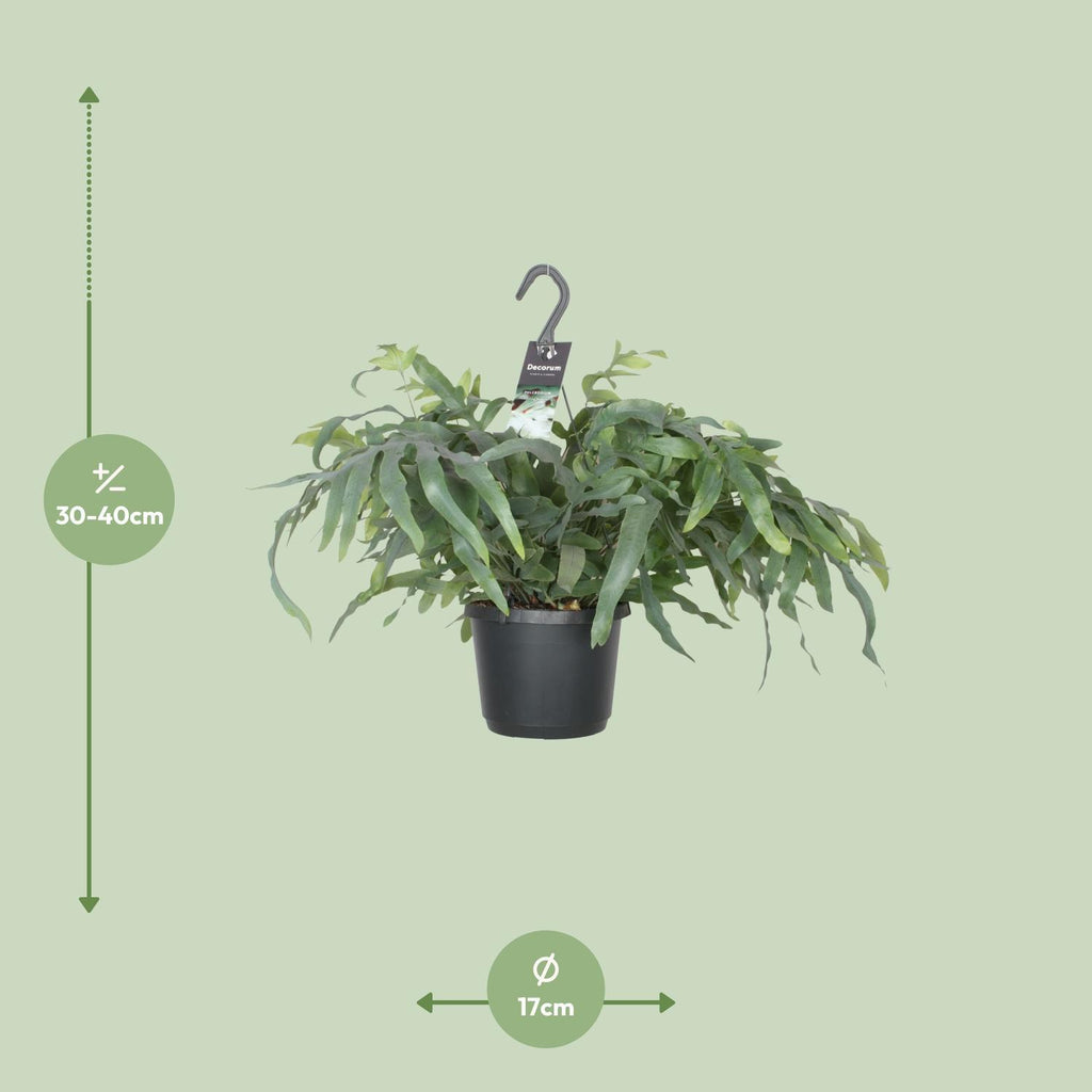 Phlebodium aureum Blue Star, ook wel bekend als het Gouden polypody, is een fascinerende kamerplant die direct een praktische elegantie toevoegt aan elke ruimte. Oorspronkelijk uit vruchtbare muurschilderingen in Amerika, heeft deze plant prachtige blauwgroene bladeren die een betoverende display creëren. Ideaal voor elke binnenomgeving, waarbij deze plant zich moeiteloos aan verschillende lichtomstandigheden aanpast, waardoor onderhoud een eitje is. Dankzij haar unieke schoonheid en het vermogen om de lucht te zuiveren, is Phlebodium aureum Blue Star een must-have voor plantenliefhebbers en een prachtige toevoegingen aan elk huis of kantoor. De Phlebodium aureum Blue Star, een prachtige kamerplant, is het toonbeeld van elegantie en weelde. Met zijn levendige blauwgroene bladeren tegelijkertijd hij een praktische verfijning toe aan elke ruimte. Ideaal voor kamers met gedeeltelijke schaduw, eist deze schoonheid de spotlights op terwijl hij koel blijft. Om deze plant goed te laten genieten, geef hem eens per week water en laat de grond het water geven door opdrogen. Zijn onderhoudsvriendelijke karakter maakt het een perfecte keuze voor drukke plantenliefhebbers. Omarm de aantrekkingskracht van de Phlebodium aureum Blue Star en transformeer jouw ruimte in een betoverende oase.Wist je dat Phlebodium aureum Blue Star, ook bekend als Blue Star-varen, niet alleen een prachtige decoratieve plant is, maar ook geweldig om de luchtkwaliteit binnenshuis te verbeteren? Deze varen is populair omdat zijn opvallende blauwgroene bladeren die een essentiële sereniteit toevoegen aan elke ruimte. Maar houd er rekening mee dat, hoewel de Blue Star-varen visueel aantrekkelijk is, deze niet geschikt is voor consumptie. Dus deze laat mooie plant je omgeving betoverend, maar weersta de verleiding om op zijn bladeren te knabbelen - het is toch beter om je smaakpapillen te verhitten met andere heerlijke recepten! Phlebodium aureum Blue Star is een populaire variëteit van de Phlebodium aureum plant, met een potmaat van 17 cm.Deze prachtige plant groeit doorgaans tot een hoogte van ongeveer 40 cm, waardoor hij ideaal is voor kleine tot middelgrote ruimtes.Phlebodium aureum Blue Star staat ook bekend als Gouden polypody, vanwege zijn prachtige goudgroene bladeren die een elegante elegantie toevoegen aan elke binnen- of buitenruimte.Deze plant gedijt op een plek met gedeeltelijke schaduw, waardoor hij perfect is voor gebieden met gefilterd zonlicht of indirect licht.Leuk feitje: Phlebodium aureum Blue Star is niet alleen een prachtige plant, maar het helpt ook de lucht te zuiveren door schadelijke chemicaliën en verontreinigende stoffen te verwijderen.