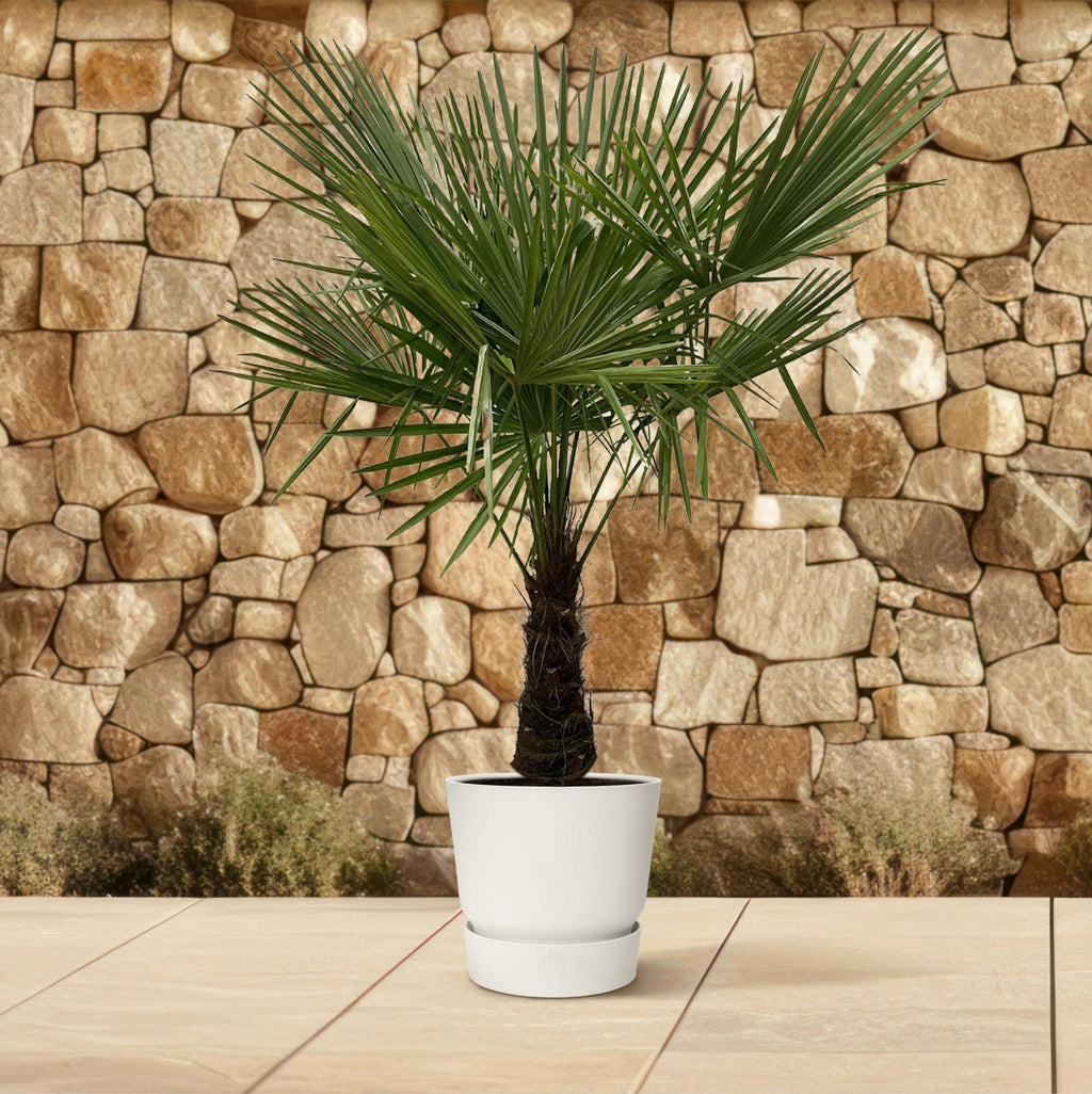 Trachycarpus Fortunei, ook bekend als de Chinese windmolenpalm, is een prachtige winterharde palmboom die een praktische tropische pracht toevoegt aan tuinen en landschappen. Met zijn slanke stam, opvallende waaiervormige bladeren en aantrekkelijke bloeiwijzen, waardoor deze palmboom direct een gevoel van exotische allure en tijdloze elegantie. Trachycarpus Fortunei gedijt goed in zonnige tot halfschaduwrijke omstandigheden en opmerkelijk een tropische sfeer toe aan diverse buitenomgevingen. Met zijn vermogen om een ​​gevoel van subtropische grandeur toe te voegen, is deze palmboom een ​​ideale keuze voor liefhebbers van vloeibare en levendige landschappen die op zoek zijn naar een opvallende en onderhoudsvriendelijke toevoegingen.